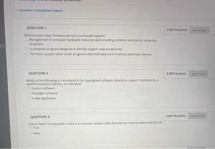 It is a computer program designed to directly support user productivity. It manages computer hardware resources and provides common services for computer programs. 285714 points Save Anower QUESTION 1 What function does firmware serve in a computer system.