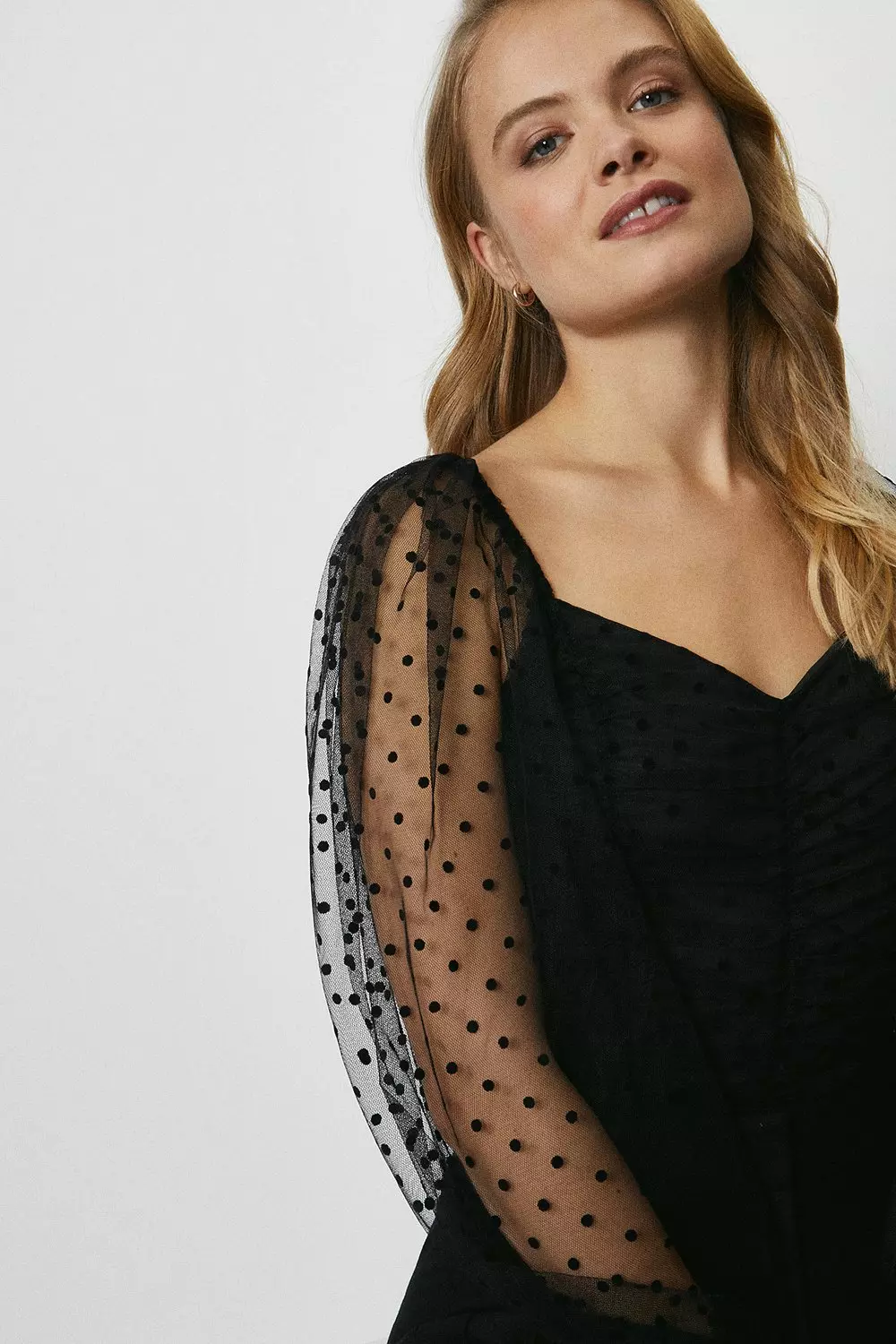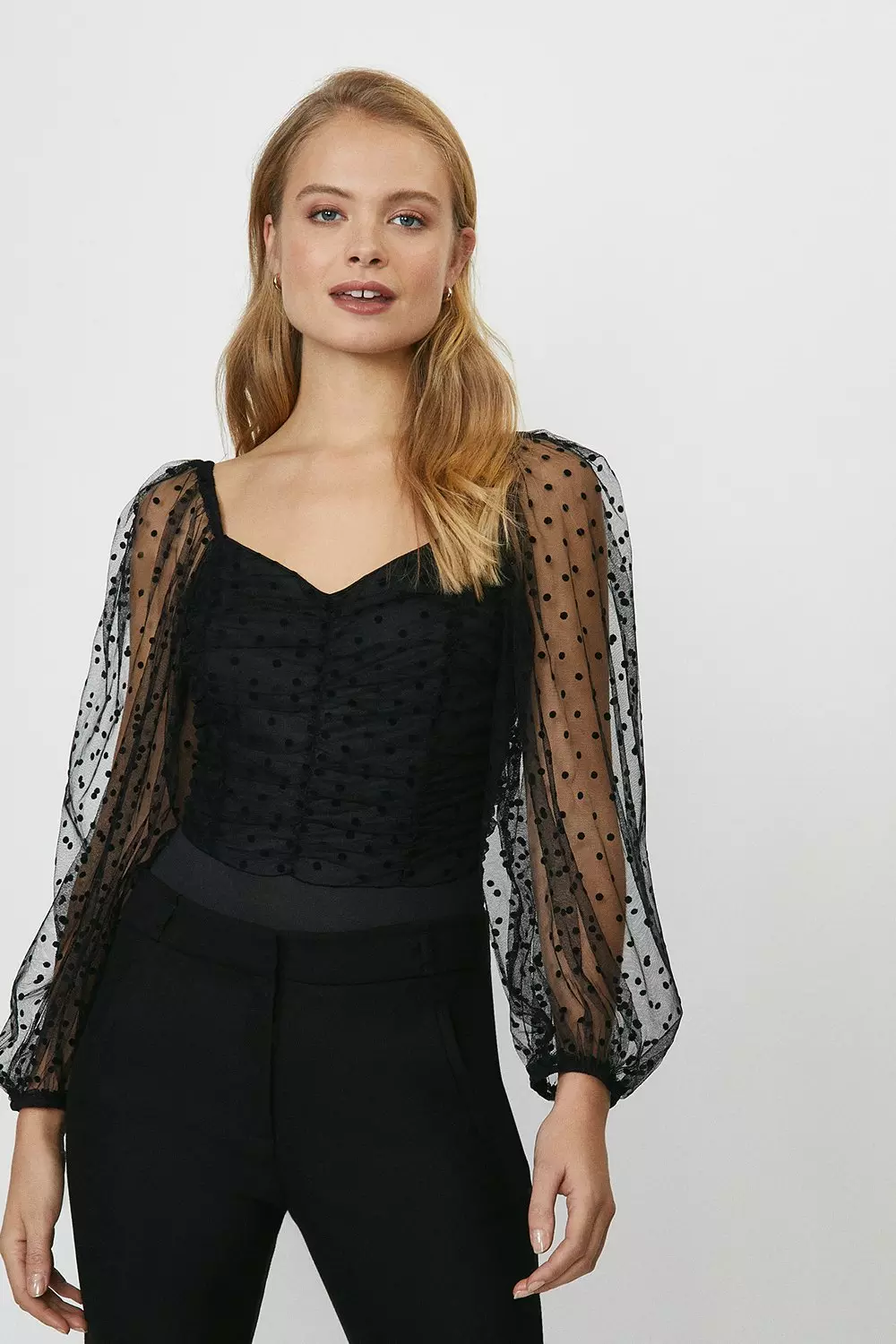 Puff SleeveSleeve Length. Stretchy mesh with subtle velvet polka dots throughout shapes this super chic top that has a V-neckline short puff sleeves with elastic at the shoulders and cuffs and a ruched bodice.